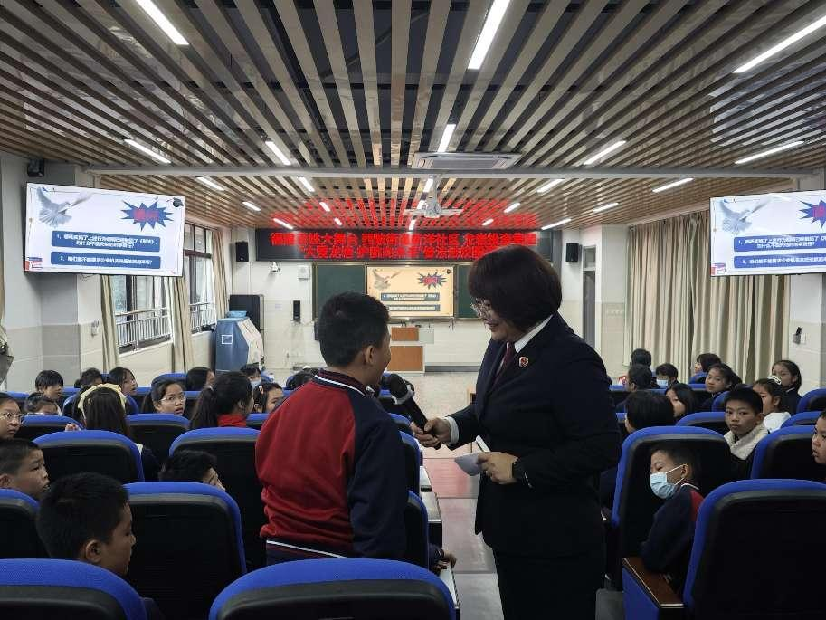 活动中,永定区法治宣讲报告员马晨曦受邀作法治宣传专题辅导,以《哪吒与法》为引,巧妙融合故事、案例,向小洋小学学生们普及《未成年人保护法》等法律法规,教导如何预防规避不法侵害的发生,当遭遇不法侵害、校园欺凌等应如何应对时专业知识,进一步树牢未成年人法治观念,提高安全防范意识,增强自我保护能力。