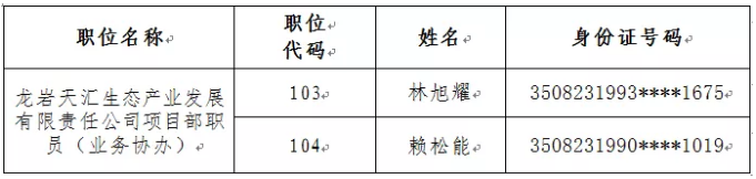 根据2021年9月27日发布的《关于延长龙岩农业发展有限公司及所属企业2021年公开招聘工作人员部分岗位报名时间的补充公告》有关要求,经报名、资格审查、组织考试、体检、考察等程序,现将龙岩天汇生态产业发展有限责任公司项目部职员(业务协办)(职位代码103、104)岗位拟聘用人员名单公示如下: