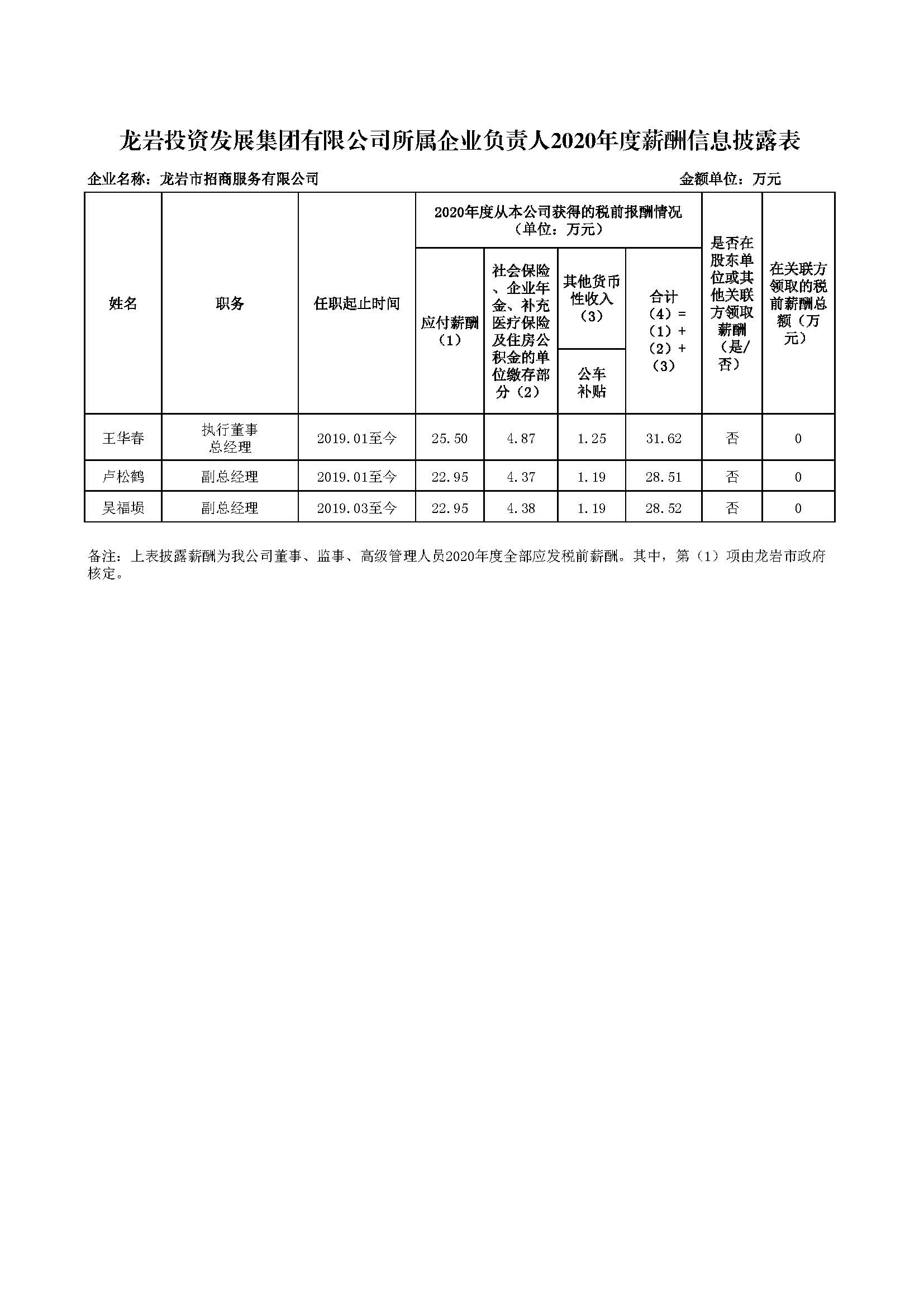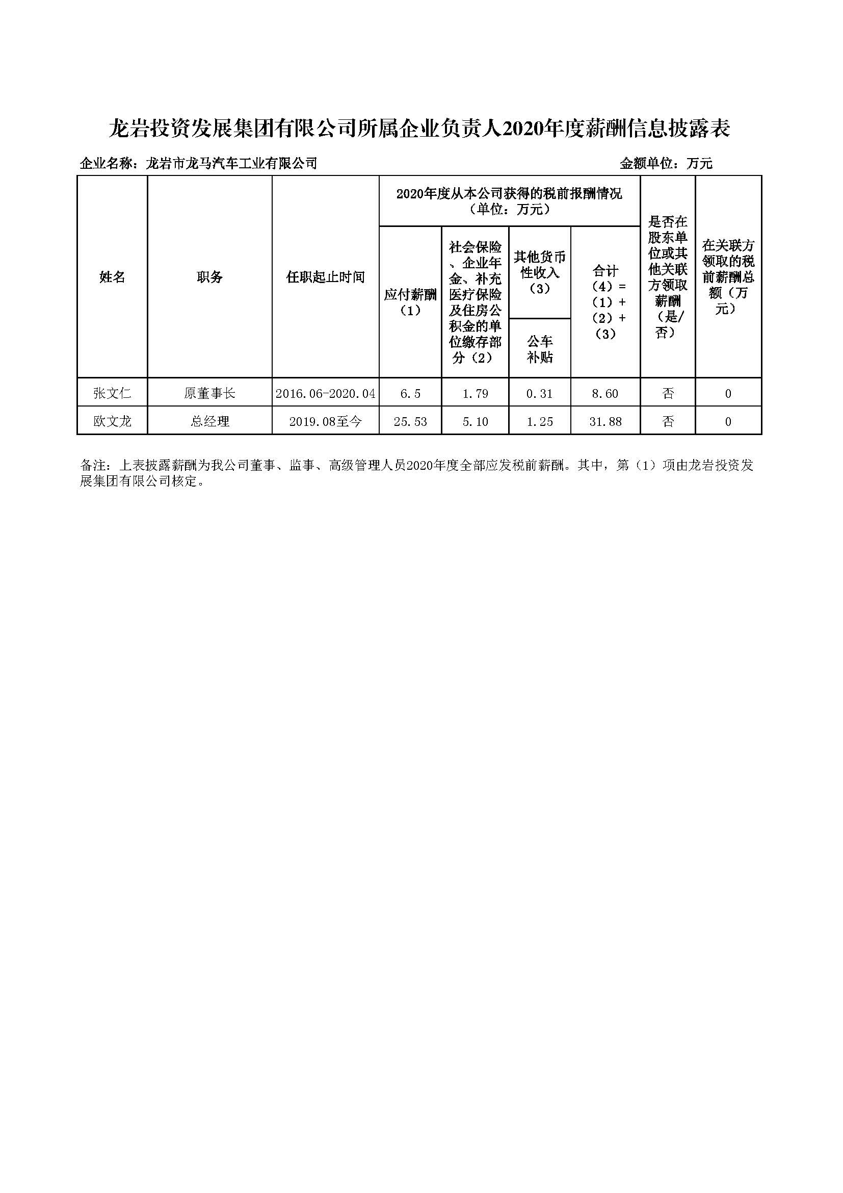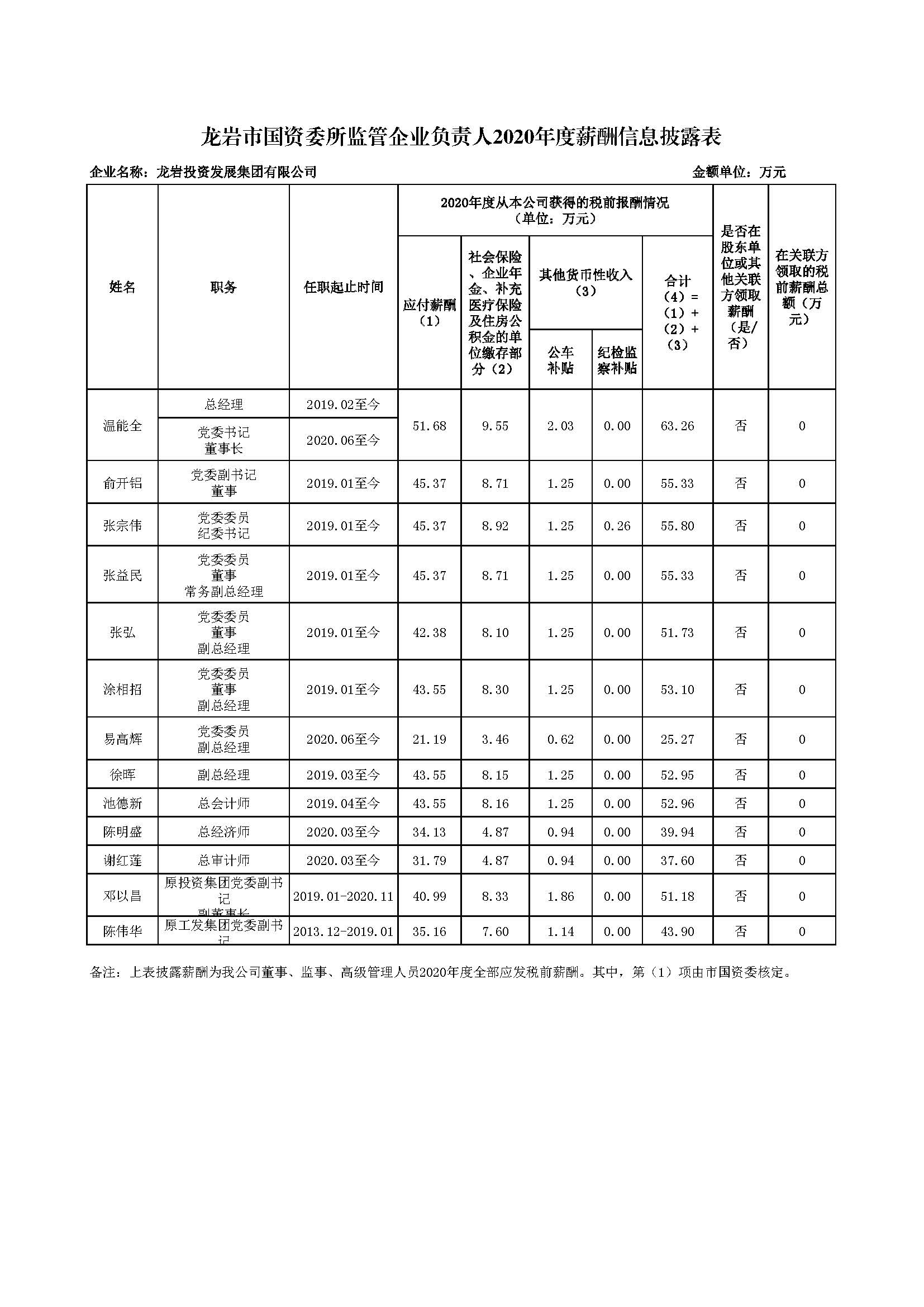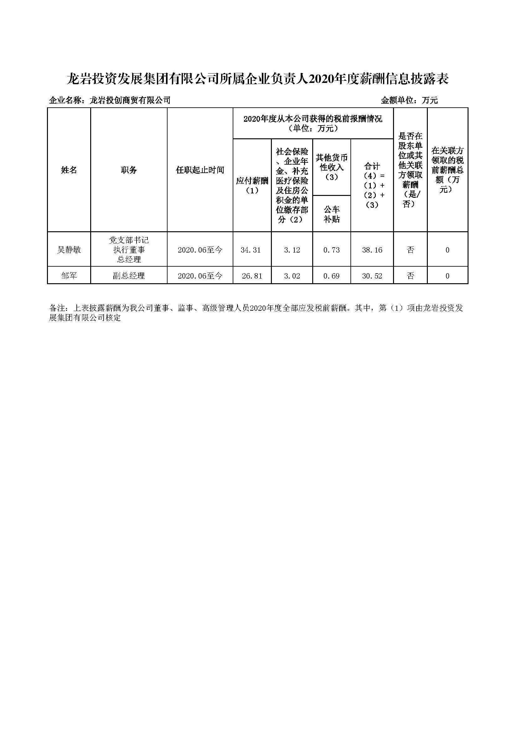 企业负责人2020年度薪酬信息披露表