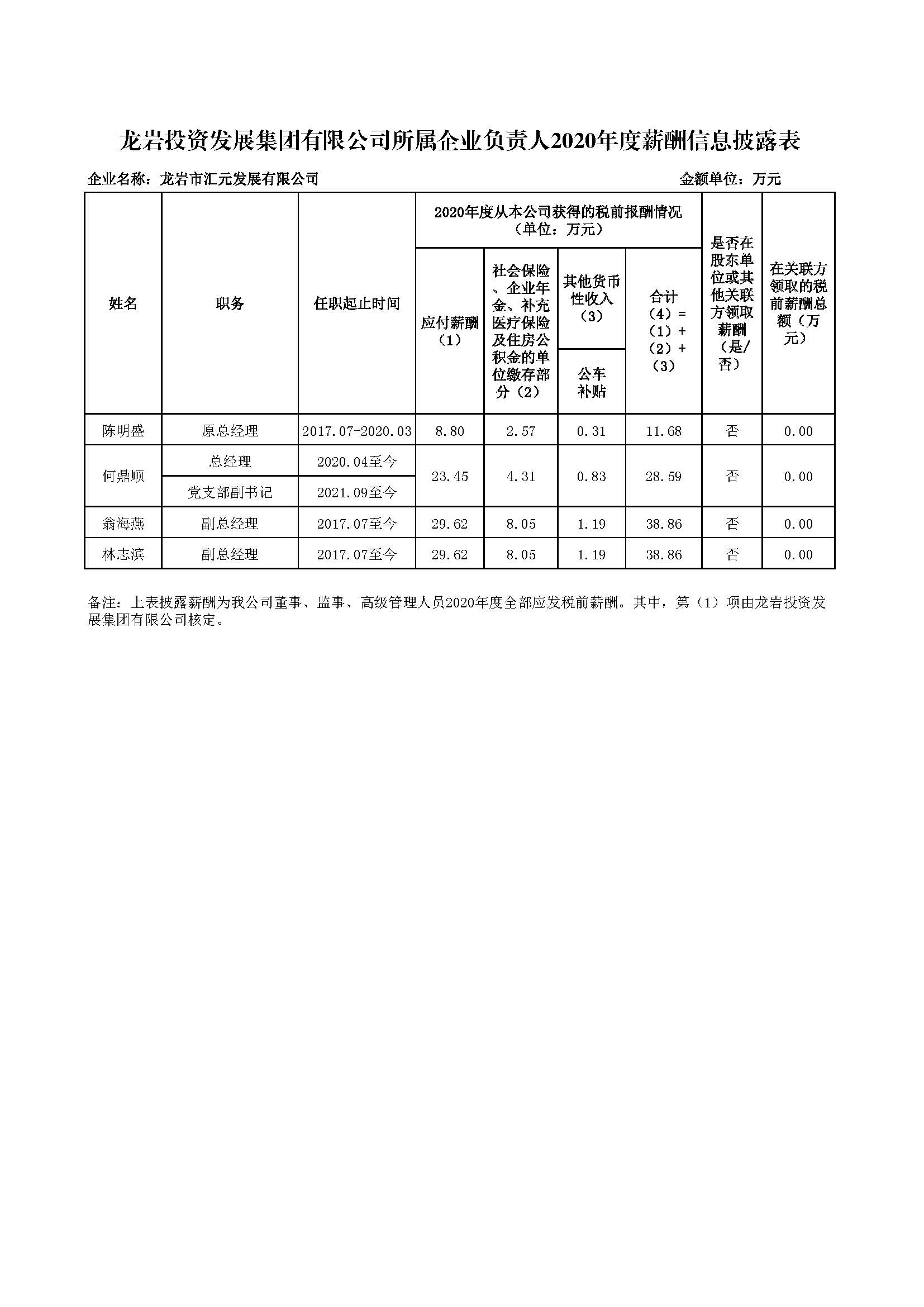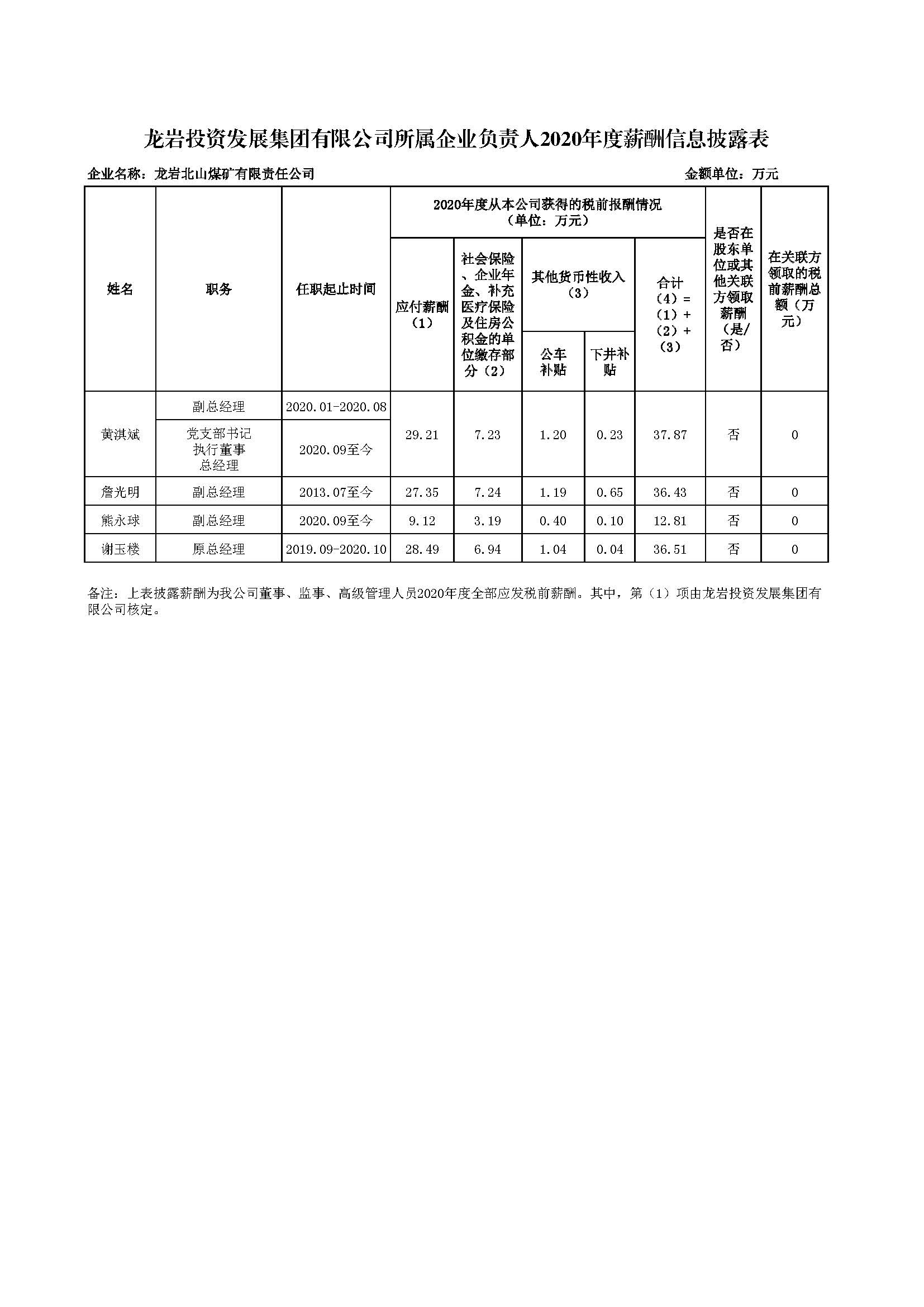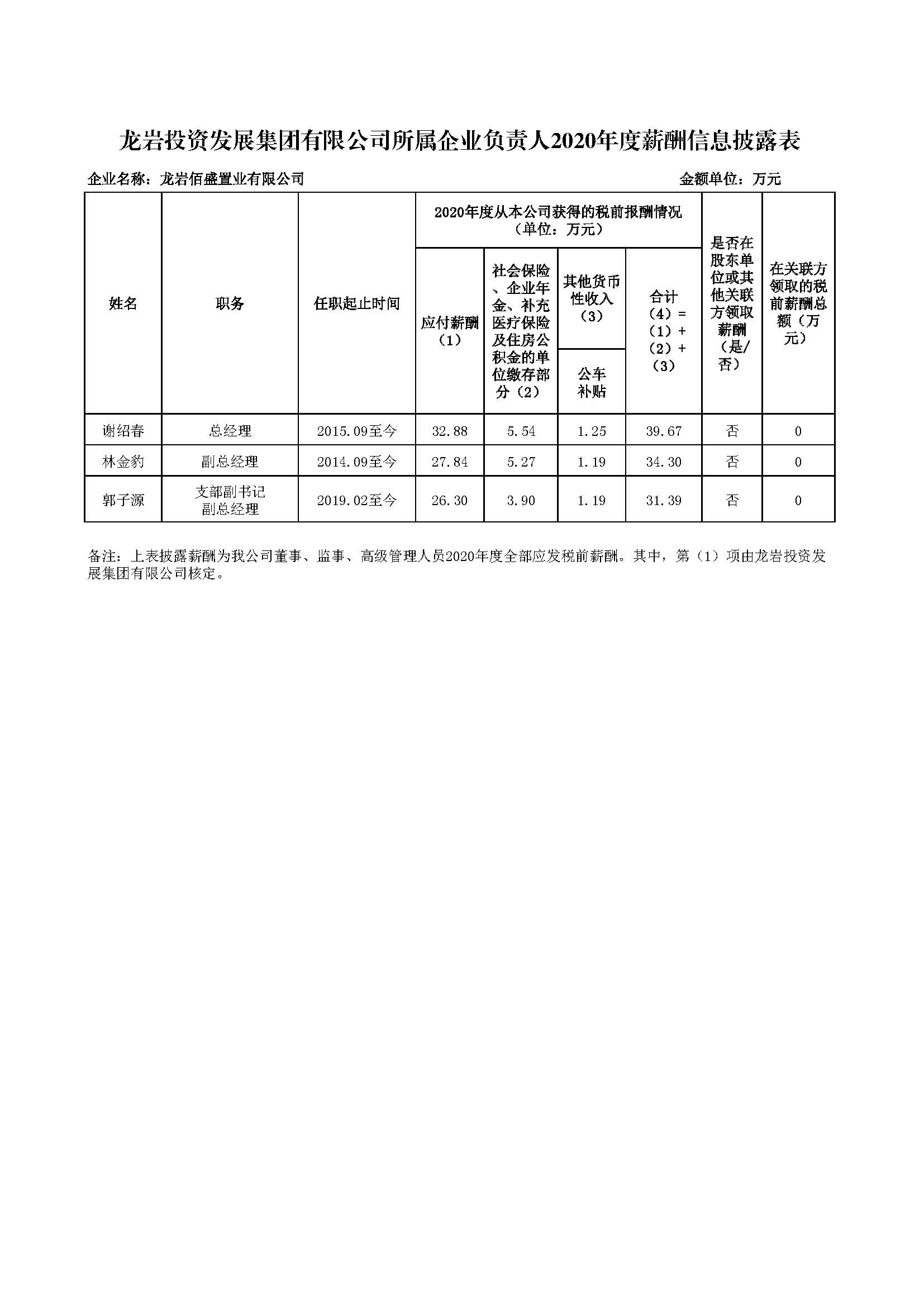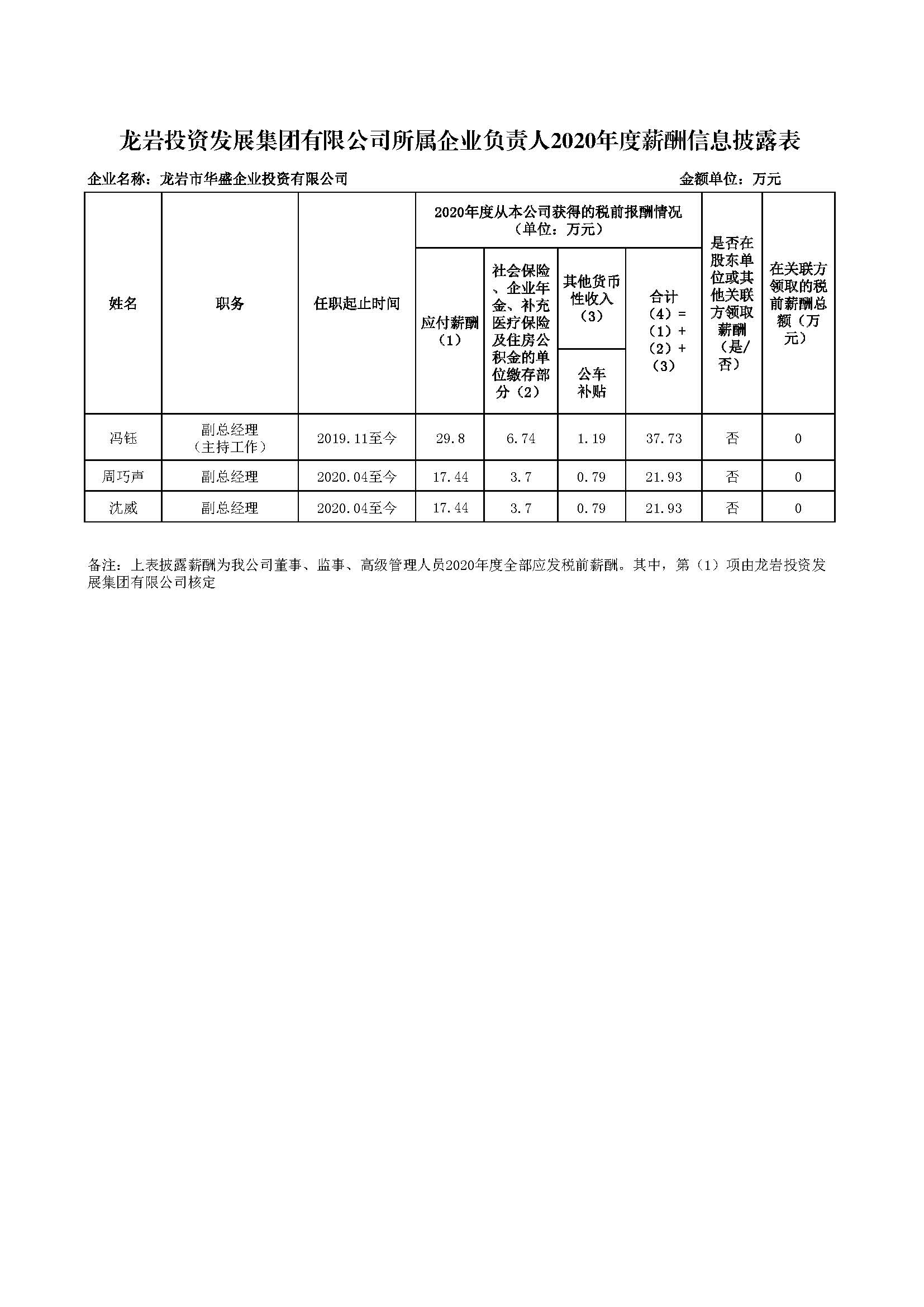企业负责人2020年度薪酬信息披露表