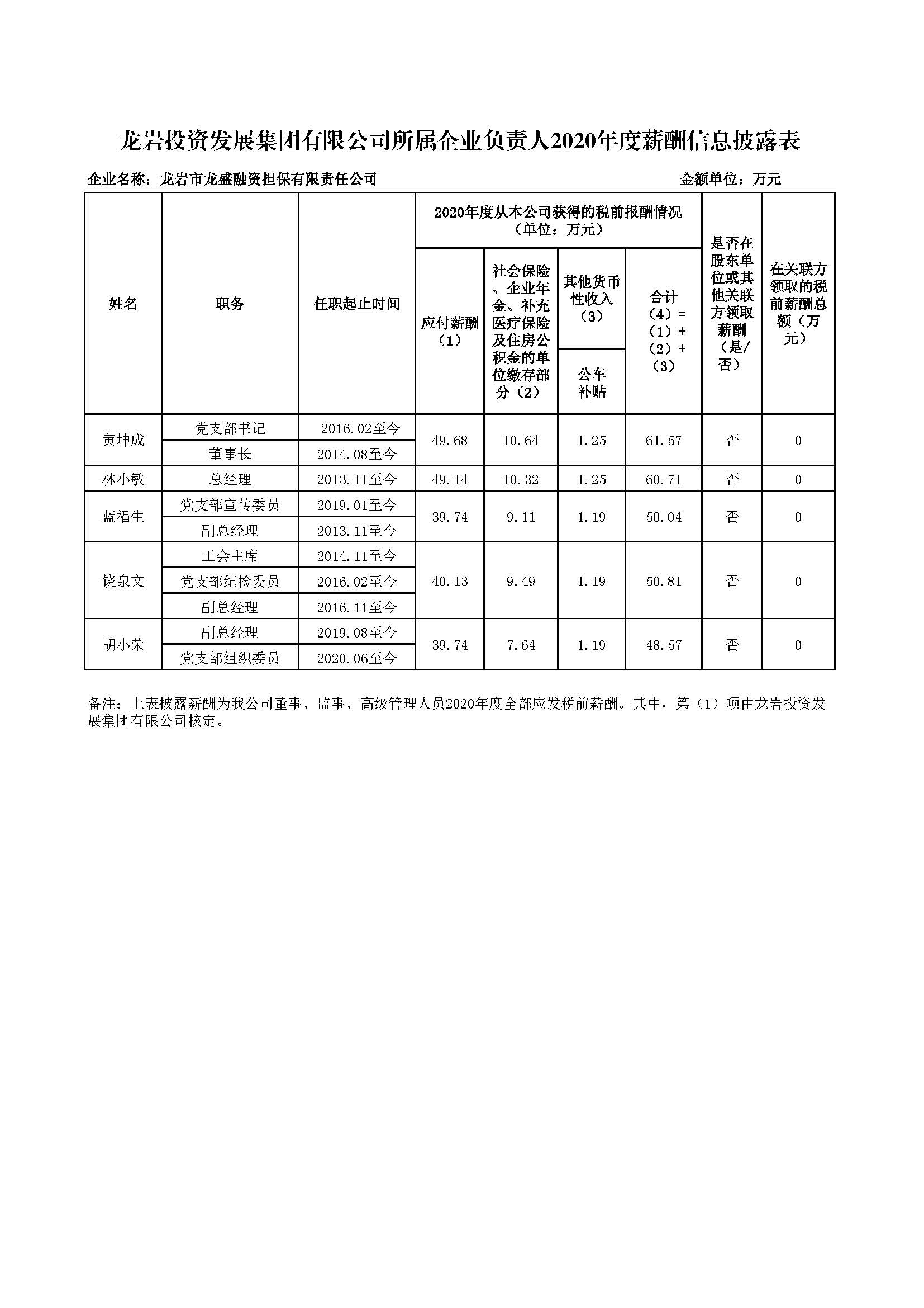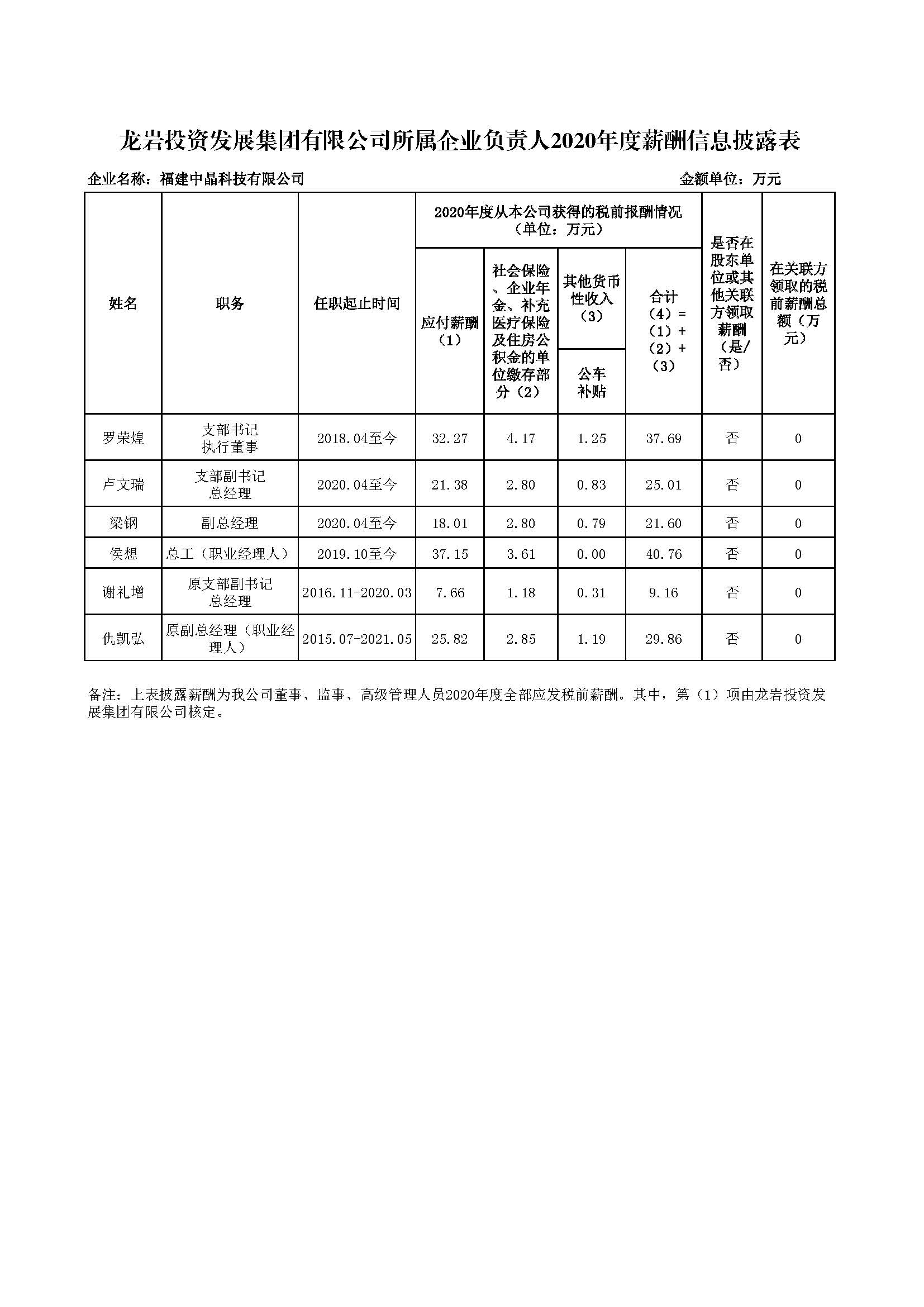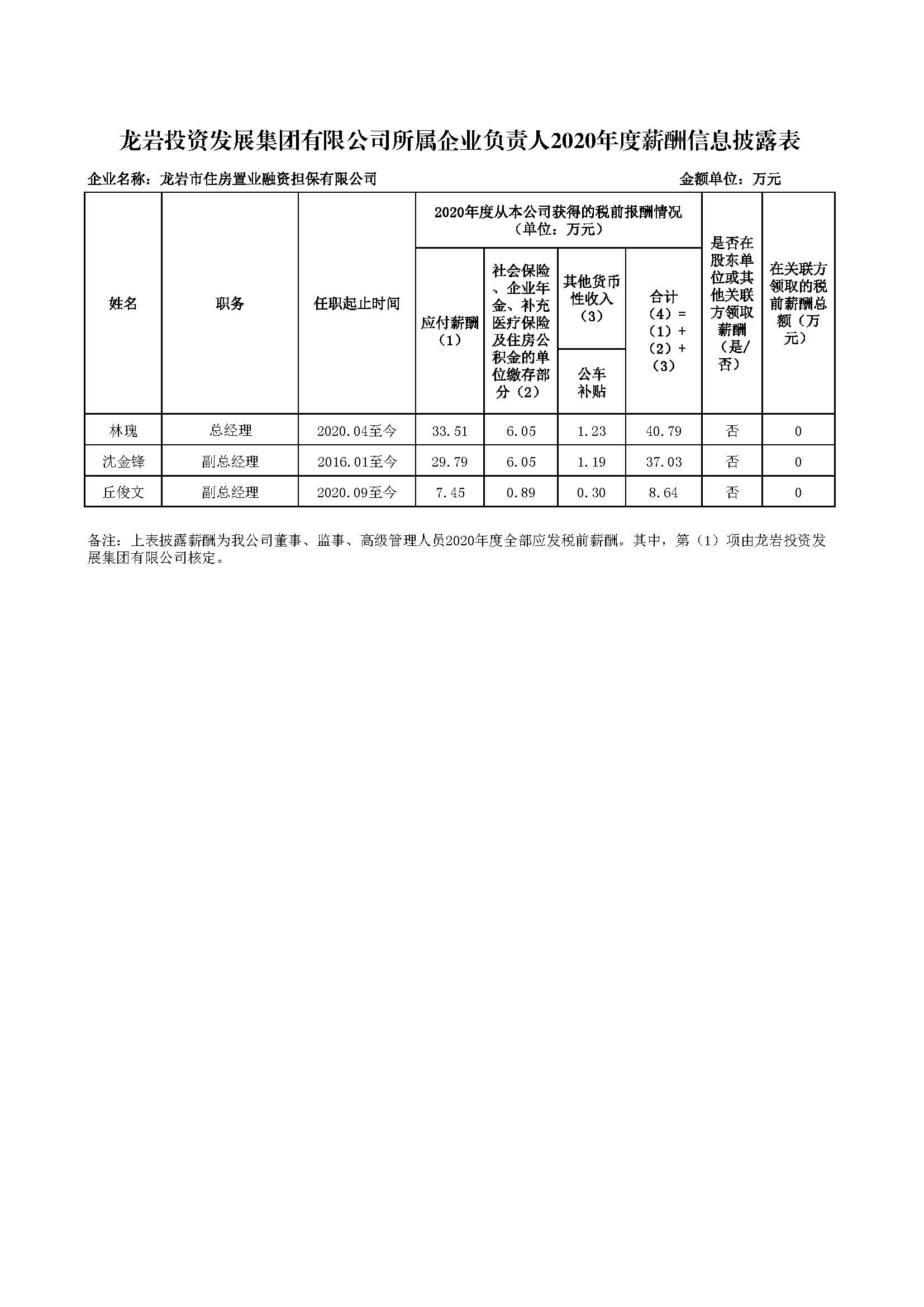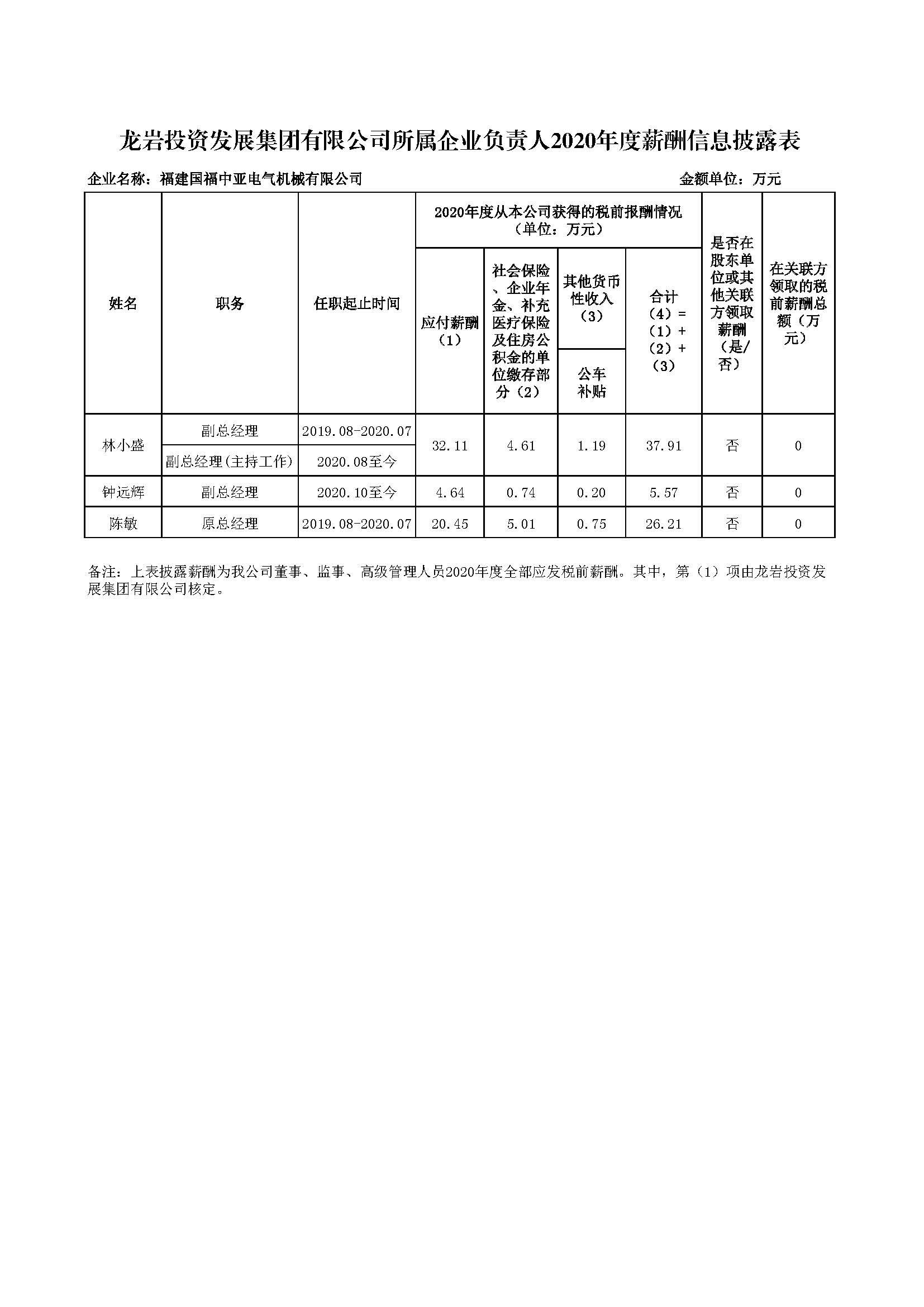 企业负责人2020年度薪酬信息披露表