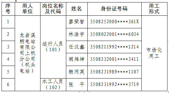 根据2024年12月12日发布的《关于龙岩市水利投资发展有限公司所属分公司公开招聘市场化用工工作人员的公告》有关要求,经报名、资格审查、组织考试、体检、考察等程序,现将龙岩市水利投资发展有限公司所属上杭分公司(矶头电站)运行人员(岗位代码101)、水工人员(岗位代码102)岗位拟录用人员名单公示如下: