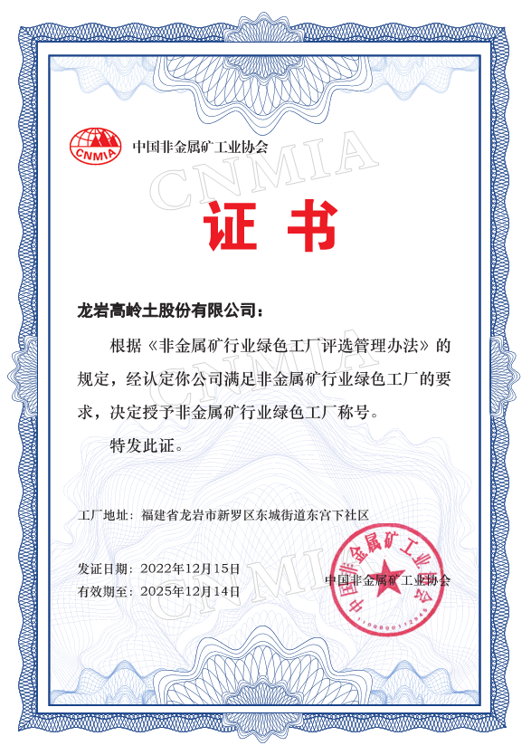 近日,2022中国非金属矿工业大会在安徽合肥召开,龙岩高岭土股份有限公司被中国非金属矿工业协会授予“非金属矿行业绿色工厂”称号。