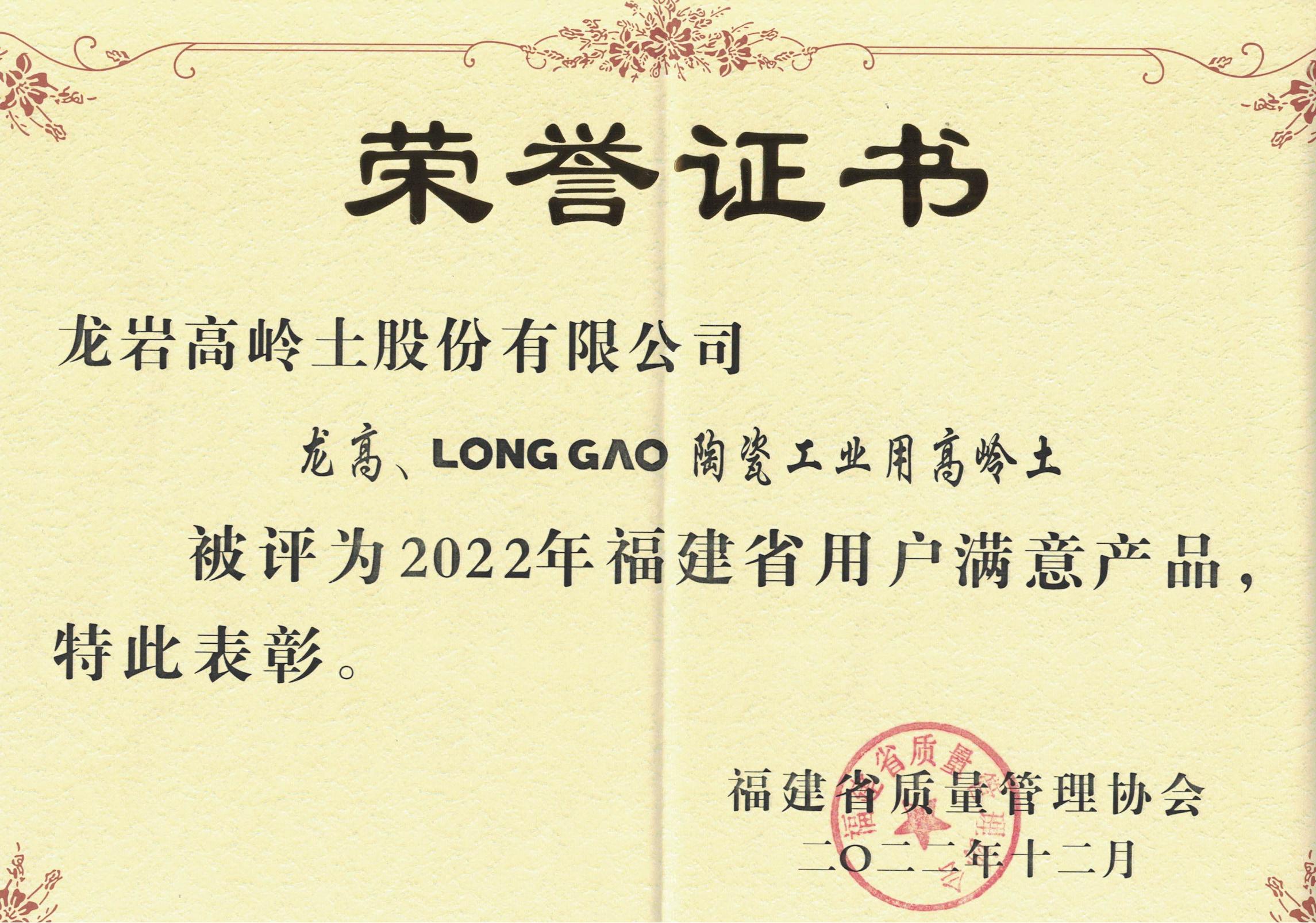 近日,龙高股份所生产的“龙高”“”陶瓷工业用高岭土被福建省质量管理协会评为“2022年福建省用户满意产品”。