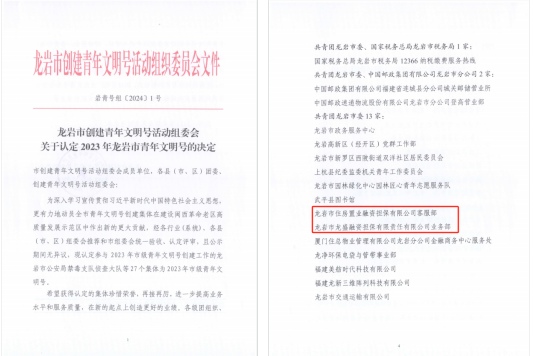 2月23日,《龙岩市创建青年文明号活动组委会关于认定2023年市级青年文明号的决定》发布,27个集体被认定为2023年市级青年文明号,龙盛担保公司业务部及子公司住房担保公司客服部两个集体获得认定。