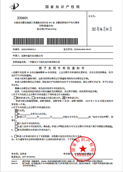 近日,国家知识产权局发布《授予发明专利权通知书》,授予中晶科技一项发明专利“一种蓝宝石与氮化镓衬底剥离方法”(专利号:202210989870.0),助力中晶科技在氮化镓材料加工等新领域寻求机遇,为后续转型升级打下良好基础。截止目前,公司已累计取得各类专利授权50余项,其中发明专利授权18项,技术布局覆盖半导体材料加工核心环节。