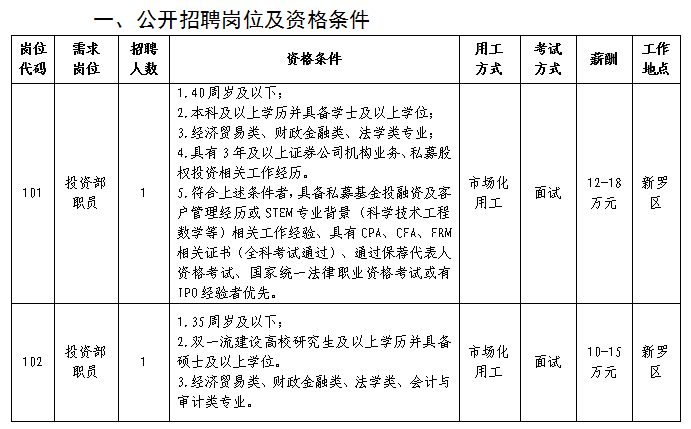 龙岩金岩创业投资基金管理有限公司成立于2022年12月,由杏彩电竞 发展集团有限公司与厦门市创业投资有限公司合资设立,主要从事私募股权投资基金管理、创业投资基金管理,负责管理龙岩市战略性新兴产业基金(国有投资)。现公司拟面向社会公开招聘投资人员2名,主要负责基金的投资运作管理及项目投后管理,包括招募子基金管理人并对其进行尽调;收集储备项目信息,对项目进行研判、尽职调查等工作;对接协调招商项目落地等工作。